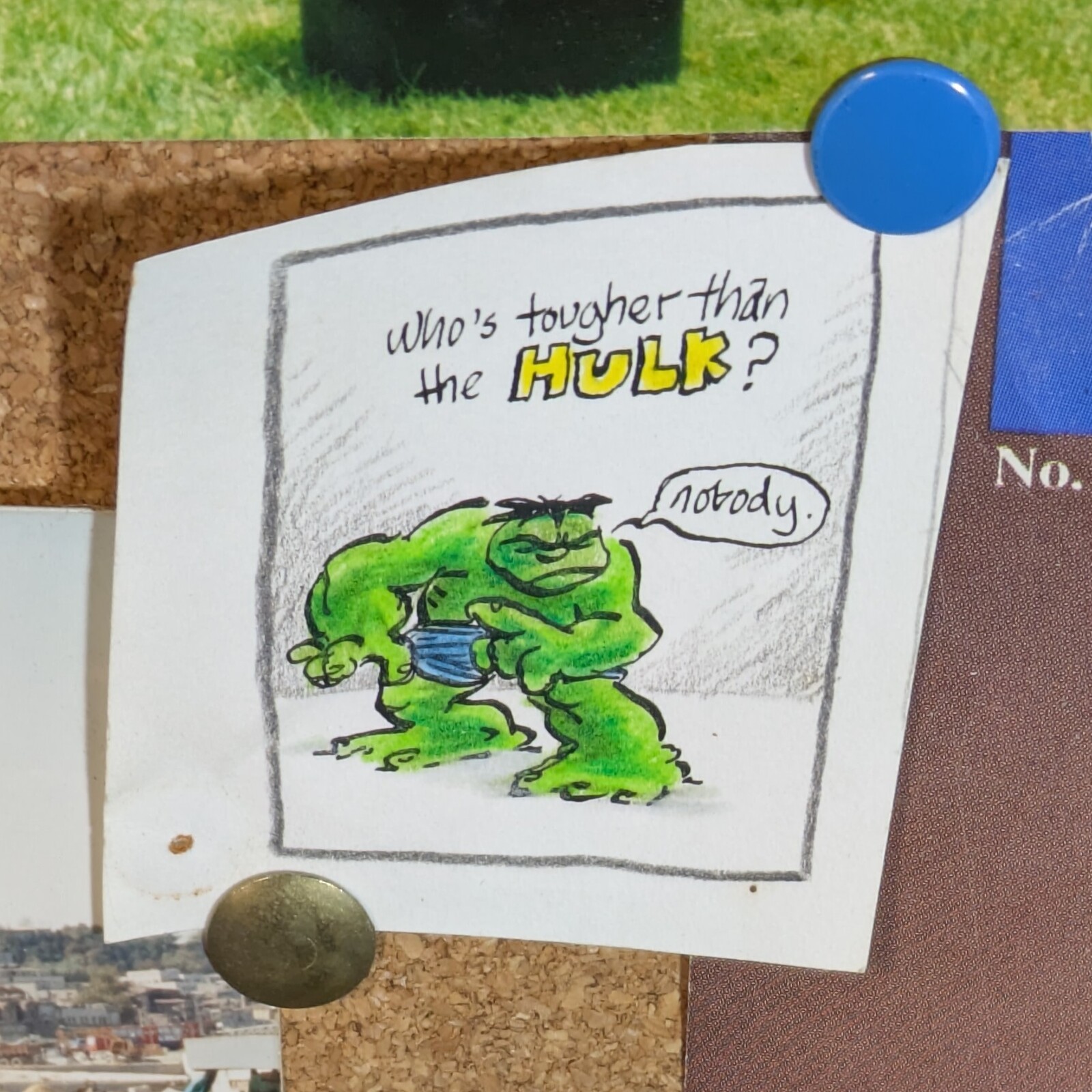 Anyway, I think it's my best drawing. I love it. It's pinned on a cork board above my desk. I really do think that NOBODY is tougher than THE HULK.